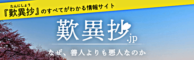 「善人なおもって往生を遂ぐ、いわんや悪人をや」しかるを世の人つねにいわく「悪人なお往生す。いかにいわんや善人をや」この條、一旦、その謂あるににたれども、本願他力の意趣に背けり。その故は、自力作善の人は、ひとえに他力をたのむ心、かけたる間、弥陀の本願にあらず。しかれども、自力の心を廻して、他力をたのみ奉れば、真実報土の往生を遂ぐるなり。煩悩具足の我等は、いづれの行にても、生死を離るること、あるべからざるを憐れみたまいて、願をおこしたまう本意、悪人成仏の為なれば、他力をたのみ奉る悪人、もっとも往生の正因なり。よって「善人だにこそ、往生すれ。まして、悪人は」と仰せ候いき。